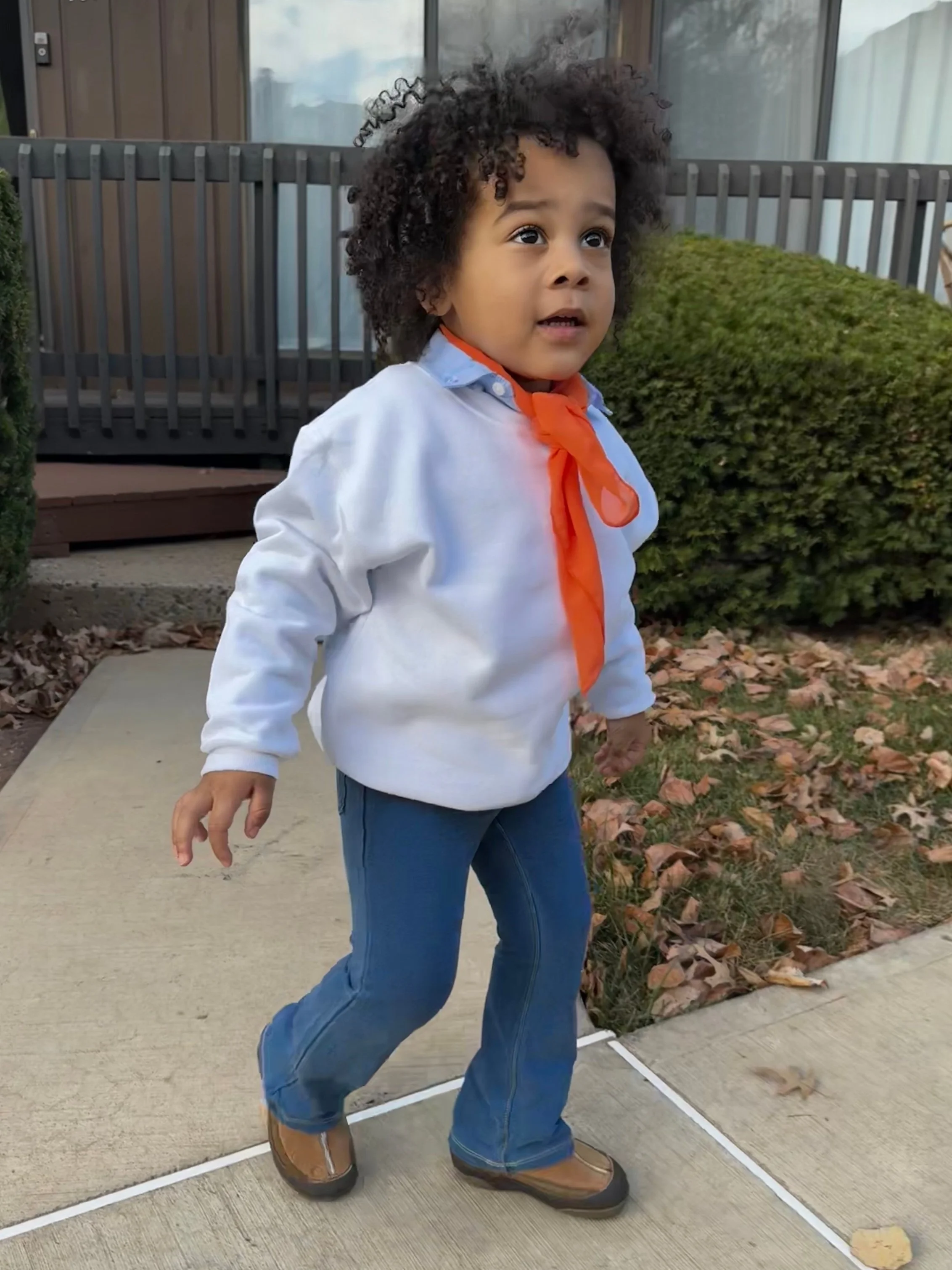 Blue bell bottom jeggings from Target. Yes these are marketed to be sold for girls, however, they were PERFECT to give the classic Fred look. A blue collared shirt from Children’s Place, White Hanes crew neck, orange scarf around the neck. Brown warm cozy crocs sourced from Poshmark.